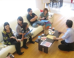 - お客様はコーヒー片手に、床に座ってリラックスしながら聞いていただいています。